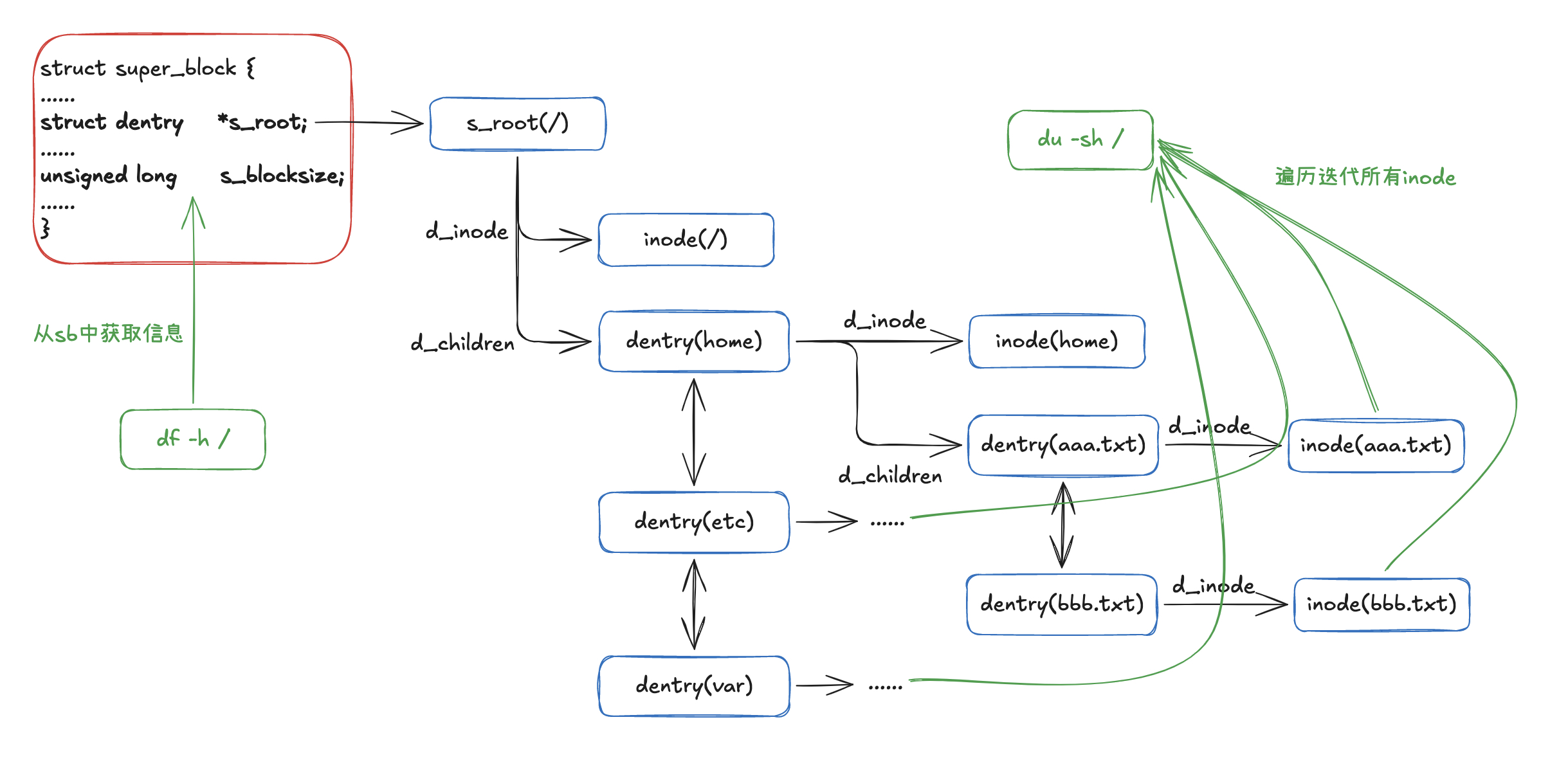 df命令是读取文件系统的sb的信息,而du命令是遍历迭代读取目录下所有的文件。