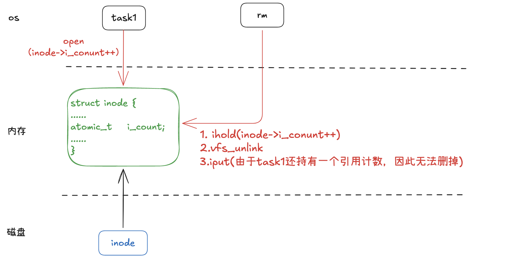 所以过程就已经很明显了:inode的释放实际上是在iput判断inode的i_count引用计数为1(减1之后变为0)的情况下才去真正地执行删除inode相关操作的。如果没有进程持有fd的情况下,rm命令执行结束后会有一次iput操作,这里可以删掉inode。但是如果有进程持有inode引用计数的情况下,rm的iput将只是减少引用计数并不能删除inode,除非等持有inode引用计数的进程自己释放fd的时候调用iput删除。
