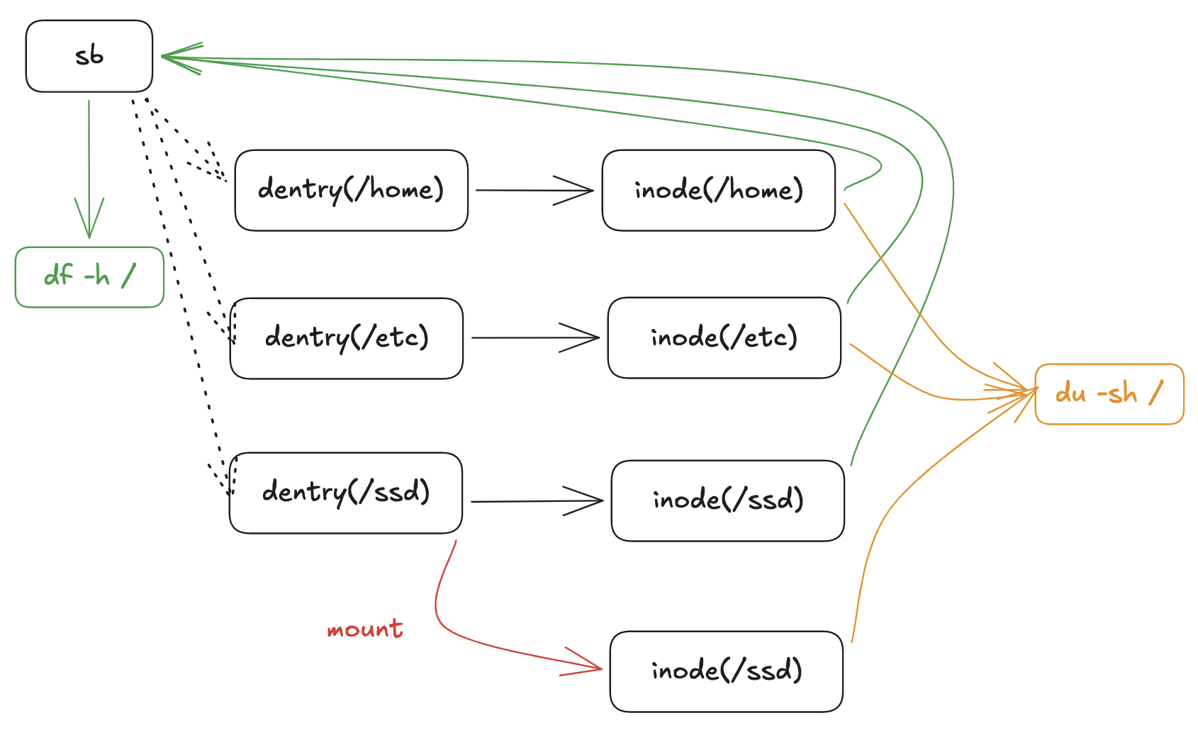 这个其实也好解释了:/ssd下原本就是有内容的,这个在当前的sb中是记录了的。然而,没有把当前目录下的内容清空就mount到了nvme盘上,这样的话,/ssd的dentry应该就指向一个新的inode了,这个新的inode就是这个新挂载的文件系统的根节点。df命令直接去找sb中的信息进行计算,未挂载前的/ssd中是有内容的切并没有释放,所以在df命令中是能够统计出来的。而du命令是通过遍历所有dentry去找inode的信息并综合计算的,当前的/ssd的dentry已经指向了新的inode,所以自然计算结果与df的不符合了。